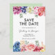 Save the Date Hochzeitseinladungen mit wunderschönen, hellen Aquarellfarben-Blume, fügen Sie Ihre Website-Adresse oder andere Details auf der Rückseite (optional). © Mini Moi Prints