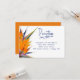 Hochzeitskarten mit orangefarbenen Blume-Design. Weiße Karten haben einen Platz für den Titel "Empfang" in dunkelblau, modernem Schriftart. Ort und Adresse des Empfangs sind in gedruckter Form. Dieses Design ist auch als Sofortdownload erhältlich.