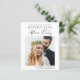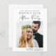 Elegantes und preiswertes Save the Date für Ihre Post-Einführung oder kleine Hochzeitsfeier. Die Vorderseite zeigt Ihr Foto "Save the Date für unser glückliches Ever After Party" in einer Mischung aus einfacher Typografie und einem modernen Drehbuch, Ihren Vornamen und Empfang. Auf der Rückseite personalisieren Sie Ihre Save the Date Nachricht detaillierter und fügen Ihre verheirateten Namen in ein signaturähnliches Skript ein.