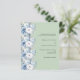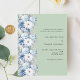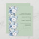 Hellgrüner Hintergrund mit staubblauen und weißen Blume. Personalisieren Sie Ihre Namen und Details und fügen Sie diese hinzu. 1 Blatt = 1 Einladung mit Druckkante bis Kante.