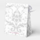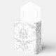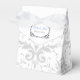 Hier sehen Sie die Gefälligkeitsbox im Zelt. Diese Box koordiniert mit der Tempelhochzeit Einladung und Empfang Einladung. Hat das Silver Coronation Muster auf allen Seiten dieses Gefälligkeitskartons. Personalisierte Namen der Neuvermählten über der oberen Klappe. Um die Namen zu personalisieren, klicken Sie nach dem Klick auf Anpassen auf die Schaltfläche "Entfalten". Passen Sie dieses Objekt Ihren Wünschen an.
