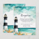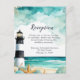 Eine schöne Hochzeitsempfehlung mit einem schwarz-weißen Leuchtturm, Seestern und Muscheln. Ideal für eine Hochzeit. Die Wörter können geändert werden, um Ihre eigenen Angaben oder Anforderungen Anzug
