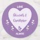 Ideal für eine lila und lila Hochzeit, um sich auf den Tischen am Empfang zu verteilen. Mit Herzen entworfen. Fügen Sie die Namen der Braut und der Bräuche und ihre Initialen und das Hochzeitstag hinzu.