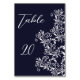 Hochzeitsempfangskarten Navy und White Elegant Tischnummer Cards mit stilvollem, weißem Dekorationstil auf marinischem Hintergrund. Der Text enthält: TABLE und eine Zahl. Um eine persönliche Note zu erhalten, geben Sie einfach eine Nummer für jede gewünschte Tischkarte ein. Beachten Sie, dass sich die Tischnummer automatisch auf der Rückseite wiederholt. Schauen Sie sich unbedingt die gesamte Sammlung von Karten und Zubehör für die Hochzeitsnacht und die White Elegant Style an.