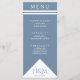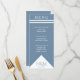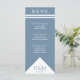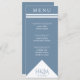 Blauer Hochzeitsempfang mit weißem, geometrischem Dreieck und Streifen. Elegante Typografie für einen teuren Look zu einem erschwinglichen Preis. Passen Sie die Speisekarte und Ihre persönlichen Daten an. Ideal für ein modernes, minimalistisches Hochzeitsmotiv mit einer Touch Stil.