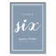 Dieses Design wurde für kleinere intime Hochzeitsfeiern geschaffen. Das einfache, minimalistische und elegante Design der Wedding Tischnummer SIX besticht durch ein zeitgemäßes Design mit einem doppelten Rahmen in knalligem Weiß auf einem staubblauen Hintergrund. Das Design ist schick und zeitlos. Personalisieren Sie das Hochzeitstisch-Design mit Ihren Hochzeitsdetails in staubblauer Schrift und Schrift. Die Rückseite der Karte ist ein Duplikat der Vorderseite. Bestellen Sie einen für jeden Tisch mit den einzelnen Tischnummern. Die Tische 1 bis 10 sind individuell gestaltet und sind in unserem Geschäft InvitationSuites auf Zazzle erhältlich. Während Sie speziell für einen kleineren Veranstaltungsort erstellt wurden, senden Sie uns bitte eine E-Mail an InvitationSuites@gmail.com .