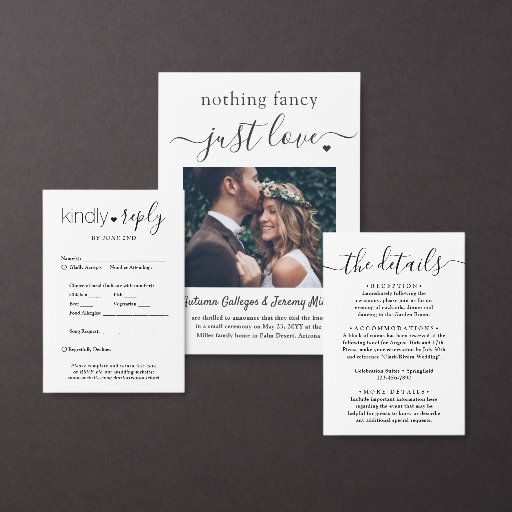 Freuen Sie sich auf einen eleganten Empfang mit einer stilvollen und modernen "nichts extravagantes, nur Liebe" 4-Foto-Collage. Alle Formulierungen sind einfach zu personalisieren für jeden Empfang nur Feiern, einschließlich ein Post-Emotion-Party, Verleihfeier, Fortsetzung Hochzeit, 1. Jubiläum, Cocktail-Stunde oder Abendessen Party. Passen Sie es an, um die von Ihnen gewünschten Details wie z. B. Ehedatum, Kleidercode, uAwg, Website usw. einzubinden (IMAGE PLACEMENT TIP: Eine einfache Möglichkeit, ein Foto genau so zu zentrieren, wie Sie es gewollt haben, ist es, es einzuschneiden, bevor Sie es auf die Zazzle-Website hochladen.) Das moderne minimalistische Schwarz-Weiß-Design bietet vier Bilder des frisch verheirateten Paares, eine trendige handgeschriebene Schriftzeichen-Kalligraphie und eine schicke Schreibmaschinentypografie. Egal, ob Sie aufgrund der Kokospanidemie entstanden sind oder auf eine kleinere, intimere Minimonie oder Mikrohochzeit reduziert werden, das Glück nach dem Party kann immer noch beginnen. Herzlichen Glückwunsch an die Braut und Bräutigam!