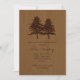 Bäume auf Holz braunen Wald Hochzeitsessen Probe Einladung mit zwei Nadelbäumen auf Holzkorn und Text in Braun. Dieses moderne und stilvolle Hochzeitsdesign ist ein vollständig anpassbares Template und ist Teil eines Hochzeitsgrades, das sich perfekt für eine rustikale Waldhochzeit eignet. Beachten Sie, dass es nicht reales Holz nur ein PRINTED-Bild gibt.