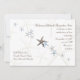 Hochzeitsfeiern am Strand mit Seestern. Horizontales Papier mit braun bedrucktem Text und einer diagonalen Linie Seestern in der Mitte. Text ist für Namen (Braut und Bräutigam einladen) und Zeremonie Informationen ausgerichtet. Der Name und die Adresse des Ortes werden in der unteren Ecke verlassen. Ändern Sie das Papier und das Aussehen von Kanten und Ecken.