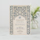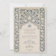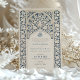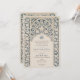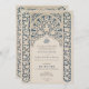 Diese raffinierte Hochzeitseinladung verbindet die zeitlose Eleganz von Marineblau mit der weichen Creme, die durch ein exquisites islamisches Spitzendesign präsentiert wird. Die Einladung zeigt einen detaillierten marineblauen Hintergrund mit cremefarbenen Spitzentypen, der die aufwändige Kunst der traditionellen islamischen Motive widerspiegelt. Das architektonische Bogendesign oben auf der Vorderseite bildet einen eleganten Rahmen für die Hochzeitsdetails, der in einer ergänzenden Cremefarben geschrieben ist. Die Rückseite setzt das Thema mit einer Spalte in voller Länge des Spitzenmusters fort, die Platz für zusätzliche Informationen oder eine persönliche Nachricht verlasse. Dieses Design, das in kultureller Schönheit verwurzelt ist, ist eine tadellose Wahl für Paare, die eine Aussage von Eleganz und Erbe machen möchten.