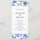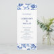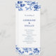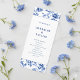 Dieses zeitlose Hochzeitsprogramm besticht durch ein klassisches Blumendesign in Blau und Weiß, das durch traditionelle Chinoiserie-Muster inspiriert wird. Feine blaue botanische Illustrationen bilden sowohl den oberen als auch den unteren Bereich der Karte und schaffen so einen raffinierten und eleganten Rahmen. Der weiße Hintergrund und der moderne Serif-Schriftart sorgen dafür, dass Ihre Zeremonie Details und Hochzeitsfeier leicht zu lesen und schön präsentiert sind. Die Vorderseite hebt die Namen des Paares hervor, zusammen mit einer klaren Reihenfolge der Zeremonie. Die Rückseite listet die vollständige Hochzeitsfeier, einschließlich Beamter, Eltern, Trauzeugin, Trauzeuge, Brautmädchen, Trauzeugen, Blume Mädchen und Ringträger. Ein herzliches Dankeschön von den beiden fügt eine persönliche Touch hinzu. Diese zweiseitige Karte eignet sich ideal für feierliche, klassische oder Gartenhochzeiten und bietet einen raffinierten und anmutigen Look.