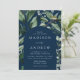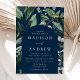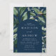 Elegante Hochzeitseinladungen mit Ihren Hochzeitsdetails, eingebettet in einem gewölbten Rahmen, umgeben von Eukalyptus, Farne und üppiger Vegetation vor einem tiefen marinistischen Hintergrund. Das botanische Botanische Bogen-Design kehrt zu einer koordinierenden soliden Marine zurück und bietet ein raffiniertes und zusammenhängendes Aussehen. Diese Einladungen, die Teil unserer Hochzeitskollektion im Grünen sind, sind ideal für Gartenfeiern, Waldfeiern oder Abend.