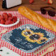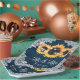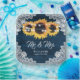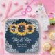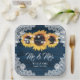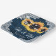 Teller aus marineblau-blauem Hochzeitspapier mit Sonnenblumen auf einem Stallholzhintergrund mit weißem Blumengeflecht und Lichtern aus Streichholz. Matching Artikel zur Ergänzung dieser marineblauen rustikalen schicken Hochzeitszeitung Teller inspiriert durch Sonnenblumen Blume.