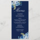 Elegante Rosen in Blau und Weiß schmücken dieses schöne Blumenmenü für Hochzeitsessen am Abend. Das elegante, weiße Rechteck wird durch hübsche indigofarbene Blume und einen zauberhaften, hellgelben botanischen Kragen hervorgehoben. Die Namen des Ehepaares sind in einer klassischen weißen Kursiv-Schrift innerhalb des Rechtecks dieser modernen Wintergunst-Ergänzung für eine zeitgenössische Braut geschrieben.