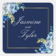 Elegante Rosen in Blau und Weiß schmücken diesen hübschen Blumenaufkleber mit Abend. Der goldgelbe Rahmen aus schicken Imitaten ist mit hübschen indigofarbenen Blume und einem zauberhaften, hellgelben botanischen Kragen besticht. Die Namen des Ehepaares sind in einer klassischen weißen Kursiv-Schrift innerhalb des Rechtecks dieser modernen Wintergunst-Ergänzung für eine zeitgenössische Braut geschrieben.