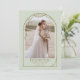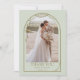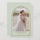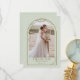 Diese Hochzeitskarte mit einem vergoldeten Rahmen aus Perlenbogen, einem bogenförmigen Foto auf der Vorderseite und einem kleinen gewölbten Foto auf der Rückseite. Personalisieren Sie den benutzerdefinierten Text oben. Matching-Elemente verfügbar.