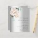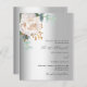 Ein Imitat silber aussehender Hintergrund. Weiße Blume, Blumen, Eukalyptusgrün. Personalisieren Sie Ihre Namen und Details und fügen Sie diese hinzu. 1 Blatt = 1 Einladung mit Druckkante bis Kante.