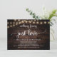 Schönes nichts extravagant nur Liebe Party feiern, Hochzeitsfeier Ankündigung / Einladung Karte, in rustikalen Bauernhof Holz, String Lights Design. Dies ist ideal für Ihren Hochzeitsempfang und Ihr Party nach der Hochzeit. Fügen Sie Ihre Daten in passender Schriftart / Schrift hinzu. #TeeshaDerrick