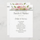Ein Hochzeitsfeierprogramm, entworfen mit einem Blumenbündel von Aquarellrosen mit grünen Akzenten. Der Text enthält: die Braut- und Wabenamen, das Hochzeitdatum und den Dienstorden auf weißem Hintergrund. Der umgekehrte Text beinhaltet: Die Namen der Eltern, die Braut und die Hochzeitsgäste des Bräutigams und die Effizienz des Dienstes. Um Ihre persönlichen Daten zu personalisieren, fügen Sie einfach alle Ihre Daten in unsere einfache Vorlage ein und ersetzen den Beispieltext.
