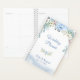 Dieses Cover auf diesem Notizbuch Hochzeitsplaner hat einen oberen Rand von blauen, pfirsichfarbenen und blassgelben Blume-Bildern, eingebettet in weiche Vegetation. Ihr benutzerdefinierter Text ist in der Mitte blau auf einem weißen Hintergrund. Ein zweites passendes Blumenbild trennt das obere Textfeld von den beiden unteren Textfeldern. Der Boden des Planers ist mit einem subtilen blauen Wasserfarbenwaschmittel versehen. Die Rückseite des Planers hat eine Wiederholung des kleineren Blumenbildes. *Dieses Design verwendet Kunstwerke von LABFcreations.