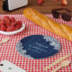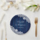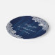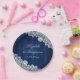Elegante und romantische rustikale marineblaue Hochzeitsfeier Teller inspiriert von Stallholz und weißer Blumenspitze.