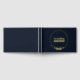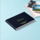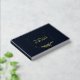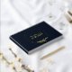Eine schöne Goldfolie Hochzeitsgast-Buch in einem tiefen, reichen Marineblau mit einem zarten Blumenkreis in Goldbride und Bräutigam Namen sind am Ende in Goldfolie.