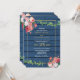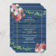 Ein wunderschönes Design mit marineblau-blauem Korngeflecht, Vintage Rose in Rosa- und Bordeaux-Farbtönen, das hängende Grün gerahmt mit einem eleganten Goldrahmen. Eine Hochzeitseinladung im Landhausstil mit blumengeschmücktem, rustikalem Holz, goldenen Akzenten, die sich ideal für jede thematische Hochzeit eignen. Es stehen auch passende Hochzeitsstilleriedateien und andere Hochzeitsformate zur Verfügung.