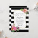 Stilvolle und romantische Hochzeitseinladung in einem schwarz-weiß gewölbten, horizontal gestreiften Hintergrund. Ein vergoldeter, dekorativer, weißer Textbereich, inmitten der Einladung, hat ein wunderschönes Aquarellwerk aus rosa Blume. Personalisieren Sie den schwarzen Text für Ihren besonderen Tag. Matching Produkte sind erhältlich.