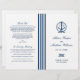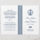 Das elegante Hochzeitsfeierungsprogramm beinhaltet einen Bootsanker mit Seilmonogramm und Streifen, wo die Programme gefaltet werden sollen. Personalisieren Sie den navy blauen benutzerdefinierten Text auf der Front und in den Innen-Seiten mit Ihrer Zeremonie Informationen und danke Ihnen Nachricht. Hinweis: Diese Textgewichtspapierprogramme kommen flach an und müssen zum Zusammenbauen zusammengelegt werden. Der weiße Hintergrund kann angepasst werden.