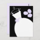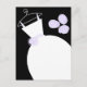 Bridal thematische Postkarte mit hübschem Design in lila, schwarz-weißen Farbtönen mit einem stilisierten Hochzeitskleid auf einem Hanger, begleitet von einem Bouquet auf der Vorderseite, und blasser lila Rückseite. Ein individualisierbares Design für Sie, um mit Ihrem eigenen Text, Bildern und Ideen zu personalisieren.