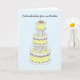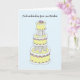 Ein mehrstufiger, stylischer Hochzeitstorte, Set vor einem blass blauen Hintergrund. Die Worte "Heute und ewig" sind auf Spanisch über dem Bild des Kuchens geschrieben.