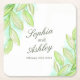Waldheirat Aquarellfeder Frischgrün Blätter Namen Papier Untersetzer. Eine großartige persönliche Ergänzung zu Ihren Hochzeitstischen oder nach einem Hochzeitsdrink oder einer Hochzeit nach dem Party. Personalisieren Sie Ihre Brautnamen und Vornamen. Ideal für Hochzeiten, Verlobungen oder Jubiläen in Natur oder Wald. Andere passende Hochzeitsartikel sind erhältlich. Aquarellkunst und Design von Sarah Trett für www.mylittleedenweddings.com