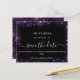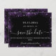 Ein modernes und elegantes Save the Date für eine Hochzeit. Schwarzer Hintergrund mit lila Imitat Glitzer. Glitzern. Personalisieren und fügen Sie ein Datum und Namen hinzu. Der Text: Save the Date ist mit einem großen angesagten, handgeschriebenen Stilskript geschrieben.