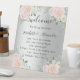 Ein Begrüßungs-/Programm, ein Timeline-Poster für eine Hochzeit. Stilvolle Imitat mit silberfarbenem Hintergrund, die mit rosafarbenen und weißen Blume geschmückt sind. Personalisieren und fügen Sie Ihre Namen und die Details. Schwarze Buchstaben.