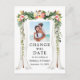 Elegante Hochzeitskanopie, tropische Wasserfarben, verändern Die neue Hochzeitstorte-Karte für Hochzeiten beinhaltet tropische Blume in Rosa, Weiß und Gelb. Der Botanische Garten des Hochzeitsvaters aus Holz ist mit Pflanzen bepflanzt. Ein paar Fotos.