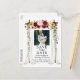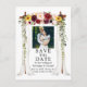 Elegante Hochzeitskanopie Wasserfarbe Burgundy Marsala Floral Hochzeitsankündigung Save the Date Postcard beinhaltet schöne bordeauxrote Rose, rosa Rosen, rote Rosen und Sonnenblumen. Der Botanische Garten des Hochzeitsvaters aus Holz ist mit Pflanzen bepflanzt. Ein paar Fotos.