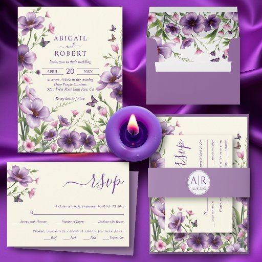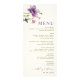 Lila und rosa Blume Aquarell Stil Frühjahr Hochzeit Budget Karte. Diese preisgünstige Speisekarte präsentiert eine wunderschöne Blumenstruktur in Aquarellfarben mit einer lila anemonähnlichen Blume, die durch rosa Blume, Blätter und einen Schmetterling in der oberen links Ecke hervorgehoben wird. Eine solide lila Farbe sorgt für eine einfache, elegante Oberfläche auf der Rückseite.