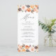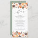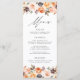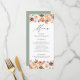 Eine elegante, auf Ihre Hochzeitsnacht abgestimmte Speisekarte mit Einzelheiten zu Ihrem Hochzeitsmenü in der Mitte der Speisekarte mit Aquarellfarben-Blume, Sukkulenten und Blätter in Rosa, Pfirsich, Orange, Creme, Braun und Grün. oben und unten. Das Menü wechselt zu einem soliden grünen Hintergrund mit Platz für Text und Fotos. Entworfen, um mit unserer Watercolor Rustic Fall Floral Hochzeitskollektion zu koordinieren.