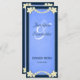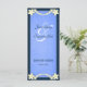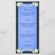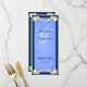 Rustikal blaue Blüte © Sunny Mars Designs. Individuell anpassbare kleine formelle Vintage rostig blaue elegante Hochzeitsmenü Empfang Dinner Karte mit dunkelblauen Band, moderne hübsche weiße Blume vor blauem, alten Pergament Papier Hintergrund.