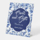 Hochzeitstabletts und Geschenkschild mit blauem Blumenbild.