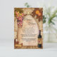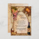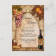 Hochzeitsunterkünfte und Wegbeschreibung oder Informationskarte zum Dinner und Tanzplatz mit einem traditionellen Gemälde mit Trauben, Blume, Herbstlauben, Kork, Perlen und einer Flasche Wein aus rustikalem Holz vor einem römischen Bogen. Eine schöne Beilage für ein Party, das sich an einem anderen Ort befindet als die Hochzeitsfeier oder für zusätzliche Informationen für Ihre Hochzeitsgäste.