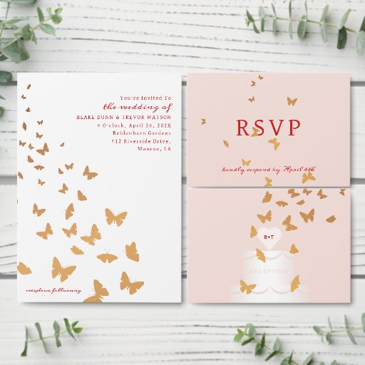 Dieses Design ist das Hochzeitsthema von Wedding Cake Butterflies, das eine Einladung mit goldenen Schmetterlingen enthält, die auf einem süßen, cremigen Hochzeitskuchen auf einem Powderrosa mit tiefrotem Akzent landen. Klicken Sie auf den Link Sammlung, um alle Produkte in diesem Thema anzuzeigen.