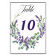 Ein eleganter weißer Hintergrund mit violettem, lavendelfarbenem und eukalyptusgrünem Dekor. Personalisieren und Ihre Tischnummern. Schwarze und lila Buchstaben.