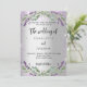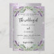 Eine moderne, stilvolle Einladung zur Hochzeit. Ein silbernes Imitat mit violettem Imitat Glitzer, Glitzern, Lavendelblumen, Blume und Eukalyptusgrün. Personalisieren und fügen Sie Ihre Namen und die Details. Zurück: Fügen Sie Ihre Hochzeitswebsite url für den QR-Code und einen Text.