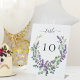 Ein eleganter weißer Hintergrund mit violettem, lavendelfarbenem und eukalyptusgrünem Dekor. Personalisieren und Ihre Tischnummern. Schwarze Buchstaben.