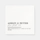 Fügen Sie mit diesen Papierservietten Ihrer Cocktailstunde oder dem Probe Dinner eine lustige Touch hinzu. Das Design verfügt über einen Header in fett formatierter Typografie mit den Namen der Paare, gefolgt von einem klassischen Skript und dann einem Template Platz für die lustige Tatsache. Finden Sie in den Kollektionsdesigns von Fakt 1 - 7 Entworfen, um "Wedding Essentials - Classic" Kollektion zu ergänzen. Finden Sie weitere Vorlagen mit den gleichen Schriftart in der Auflistung. Wenn Sie ein Stück, das nicht in der Sammlung ist, bitte lass mir wissen (Maria) ... gerne helfen!