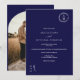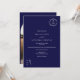 Klassisches, elegantes und weiches blumenblaues Hochzeitsarsch-Foto mit kleinen, geblüht Konturen, fügen Sie Ihr Paar monogramm, mit boho marineblau eine klassische Hochzeitseinladung mit einer modernen Drehung, fügen Sie Ihr Foto auf dem Rücken in einer Bogenform.