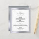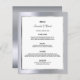 Eine elegante, glamouröse Hochzeit oder eine 25. Hochzeitskarte. Vorlagen für Ihre Namen, Datum und das Hochzeitsmenü. Ein silber-weißes Imitat und ein elegantes, glamouröses Imitat silber metallisch anmutend Hintergrundfarbe. Schwarze Buchstaben. Zurück: Imitate silber metallisch aussehender Hintergrund.