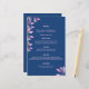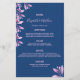 Eine elegante und trendige Blumenkarte für Hochzeiten. Personalisieren und fügen Sie Ihre Namen, Datum und das Hochzeitsmenü. Blauer Hintergrund mit rosa botanischen Krätzen und Blattwerk. Ihre Namen werden mit einem modernen handgeschriebenen Stilskript geschrieben. Zurück: blauer Hintergrund.