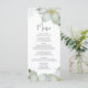 Dieses Design bietet ein Hochzeitsmenü mit eleganter Kalligrafie und einem schlichten, weißen Hintergrund mit magnolischen Blume, magnolischen Pflanzen und Blumenakzenten, die sich perfekt für die Gestaltung des Empfangs eignen